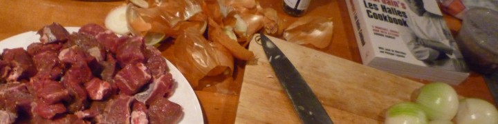 Anna had told me how she’d always wanted to make Elizabeth David’s ‘Maiale al Latte’ — published in 1954 and found in the ‘best of’ collection South Wind through the Kitchen. Since I had the Les Halles version on my horizon and we were both at a loose end on Christmas Day, we somewhat inappropriately made this pork and milk dish the plat du jour. We also made what appeared to be a fairly successful clafoutis.