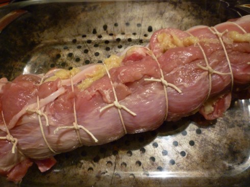 Back to the prep. Pitting out 675g of cherries and macerating them in Kirsch for an hour, meanwhile removing the skin from the pork — a nasty and difficult task — then binding it up. The reason I didn’t initially question the clove was the absurdity/subtlety of the other aromatics Elizabeth demands: “Stick a clove of garlic inside the rolled meat, together with 3 or 4 coriander seeds and a little marjoram, basil or fennel”. I read this as ‘blindly fumble about your herb rack and fling in a pinch of whatever — the Joneses won’t know the difference’.