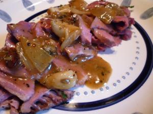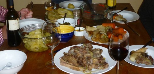 I dont have an enormous serving platter with which to arrange the meat and vegetables in “an attractively disheveled fashion”, but instead unloaded the contents onto the biggest plates available, along with a bowl each of sea salt and cornichons, and as much mustard as could be mustered. The meal satisfied all my flatmates(err.. except the vegetarian), and my parents – which in itself was an interesting and successful experiment. There was more than enough to go around, and loads of leftovers. All the meats were deliciously tender and flavorsome, and the veges interesting. Especially the large sections of leek, and the celeriac. A delicious success, and Im left looking forward to next time.