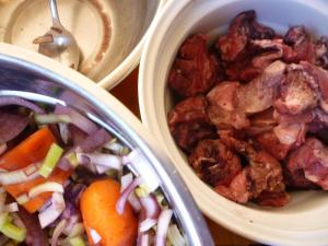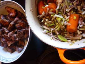 I cut the shoulder up into large cubes then placed in a bowl with diced onion, carrot, garlic and leek and added “1 cup/110ml of the wine” – which is it Tony? Half a cup or a full cup?? I added a full cup, then marinated overnight. At this stage in proceedings, the ingredients and aroma very much matched Soupe au Vin. Not a great sign of things to come, since I wasnt really taken with the winey leeky soup. On the other hand, Coq au vin starts out somewhat like this and is excellent.