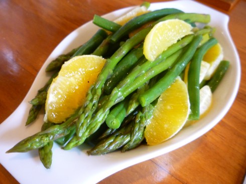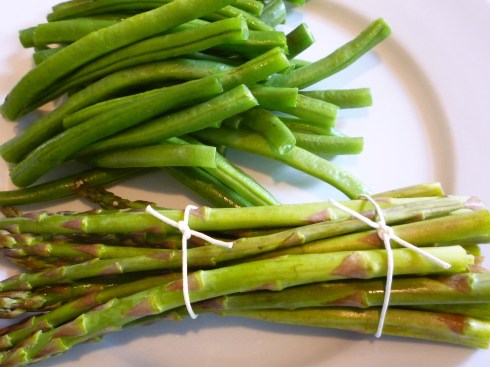 With ease of preparation, great looks on the table, and a suitably fancy french name, Asparagus and Haricots Verts Salad will be joining the table with those from other pages that have been repeated and have become part of my repertoire. The lemon in the dressing, and the segments of orange lend a refreshing citrussy – my flatmate Jo says “it tastes really ’70s” – flavour, offset by the salt and pepper and oil. Mmm mmm!