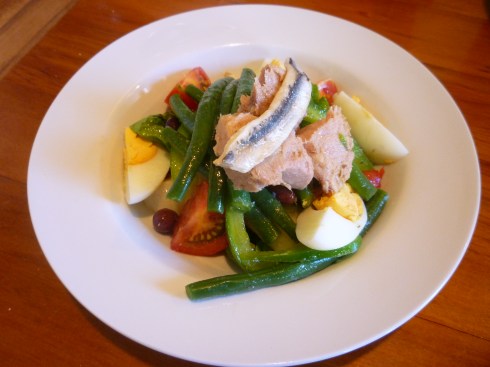 A [relatively] simple, colourful, delicious and filling salad. Note the fancy Niçoise olives, imported tuna and white anchovies. The dressing is red-wine-vinegar and olive oil, whisked together with garlic. I’m sure I’ll be using this method again along with the above boiled eggs.
