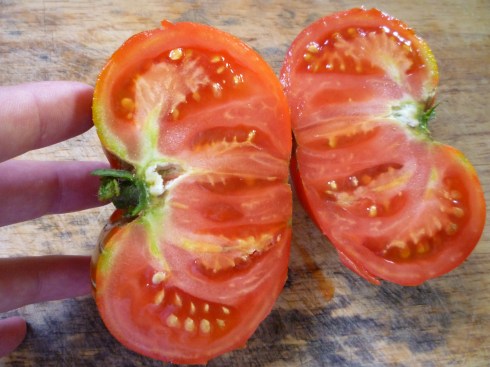 I have 21 heirloom tomato plants growing in the back yard – all descendants of a single tomato from last years harvest.. this guy:
