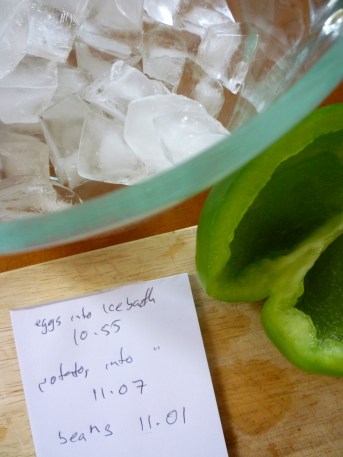I have never blanched anything before. All of a sudden there is a queue for the ice bath. I followed the recipe from another part of the book for boiled eggs: place eggs in cold water in pot. Bring to boil. Take off heat and leave with lid on for 10 mins. Transfer eggs to ice-bath then peel when cold.