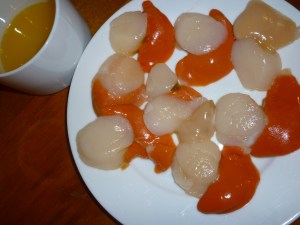 In his intro Bourdain unloads a diatribe about the difference between real sea scallops and various other types, variously marinaded or too small, but never mentions the roe, which I bet he discarded, as I have heard it is done on the Eastern seaboard, if not the whole of northern America.