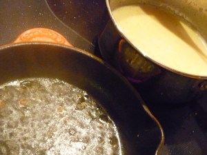 Season with S & P and fry till crispy and golden-brown in all that clarified butter then remove from pan. Tip off remaining fat and appreciate the remaining delicious bits of stuck-on goodness (as we have learned, this is the ‘fond’), before stirring in the Champagne. When it has reduced so it sticks on the back of spoon – but in my case it is about to erupt in flames, as I had entered into an unrelated discussion on cooking almonds – add the creamy sauce that has been sitting to one side.