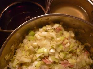 Sauteed butter, onion, bacon and leek smells amazing, but after the stock and wine were added it prompted my flatmate to comment that it smelled delicious but looked like soupy catfood. I tend to agree.