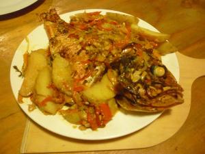 Also just right was the amount of liquid, the done-ness and deliciousness of the potatoes, and the crispyness of the fish. Some of the best (cooked) fish Ive ever had.